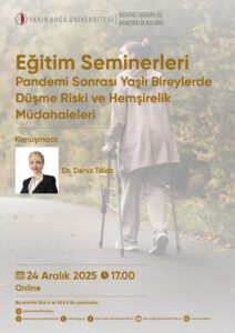 Yakın Doğu Üniversitesi Öğrenci Dekanlığı ve Hemşirelik Kulübü eğitim seminerleri kapsamında, Hemşirelik Fakültesi Öğretim Üyesi Dr. Deniz Talaz, çevrimiçi platformda öğrencilerle bir araya gelmiştir. Seminerde, ‘Pandemi Sonrası Yaşlı Bireylerde Düşme Riski ve Hemşirelik Müdahaleleri’ konusu ele alınmıştır. Öğrencilerin yoğun katılım gösterdiği sunum sonunda, Hemşirelik Kulübü Başkanı Süleyman Bostancı tarafından teşekkür ve katılım belgeleri takdim edilmiştir.